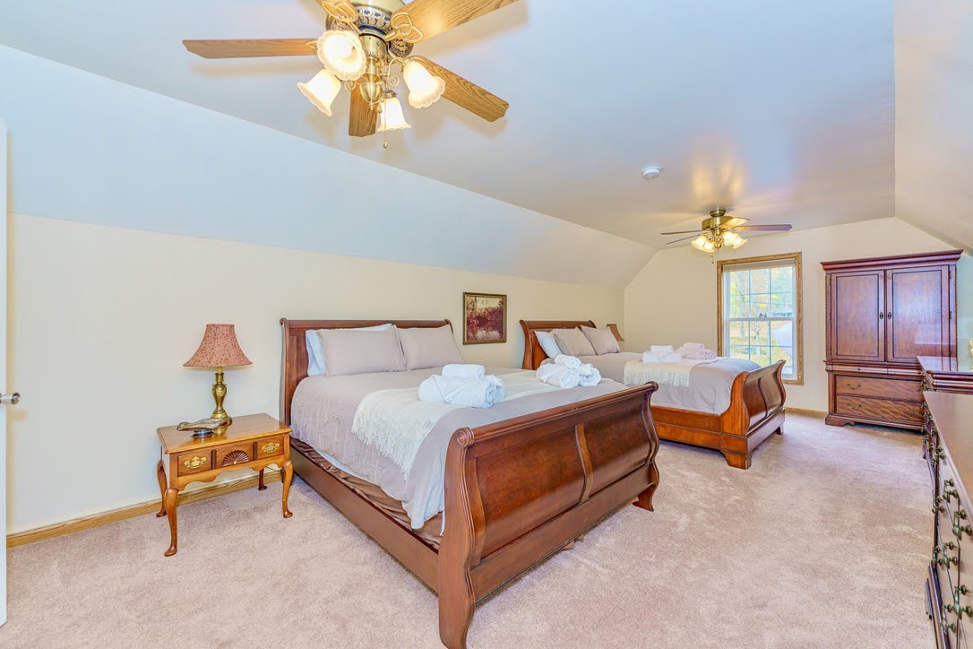 Upstairs is the second full bath, one queen bedroom with locally crafted Adirondack bedset, a railroad fouton room that accesses another bedroom with two queen bedsets.