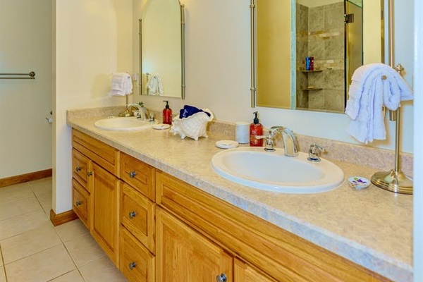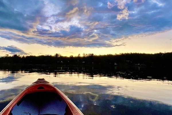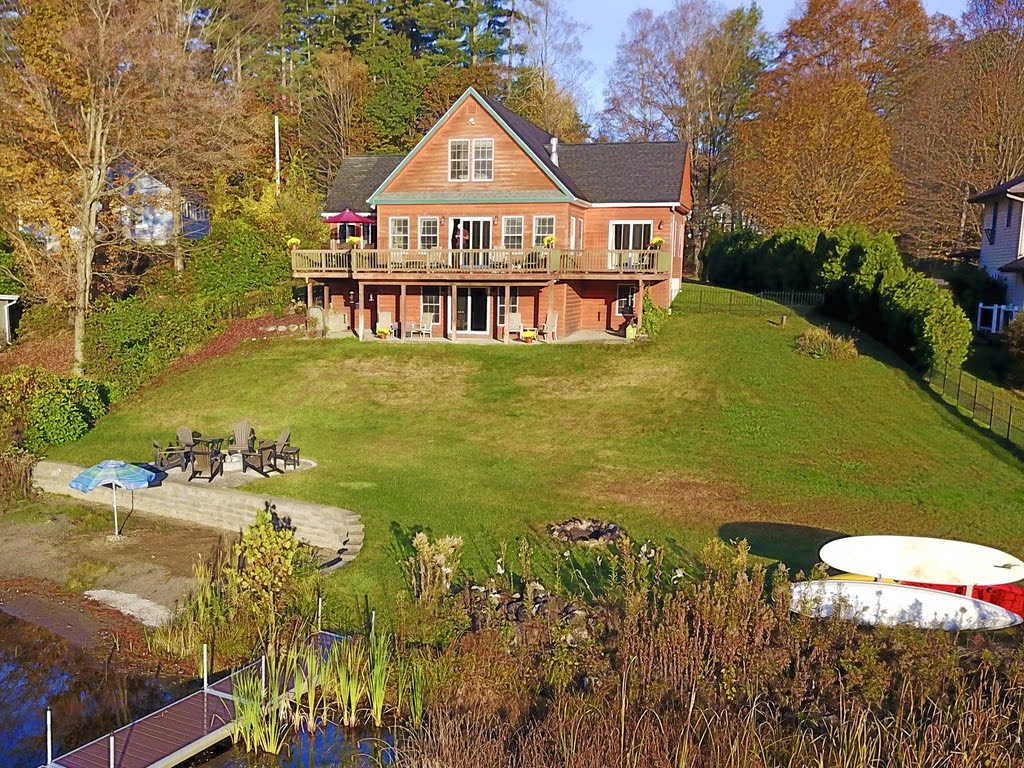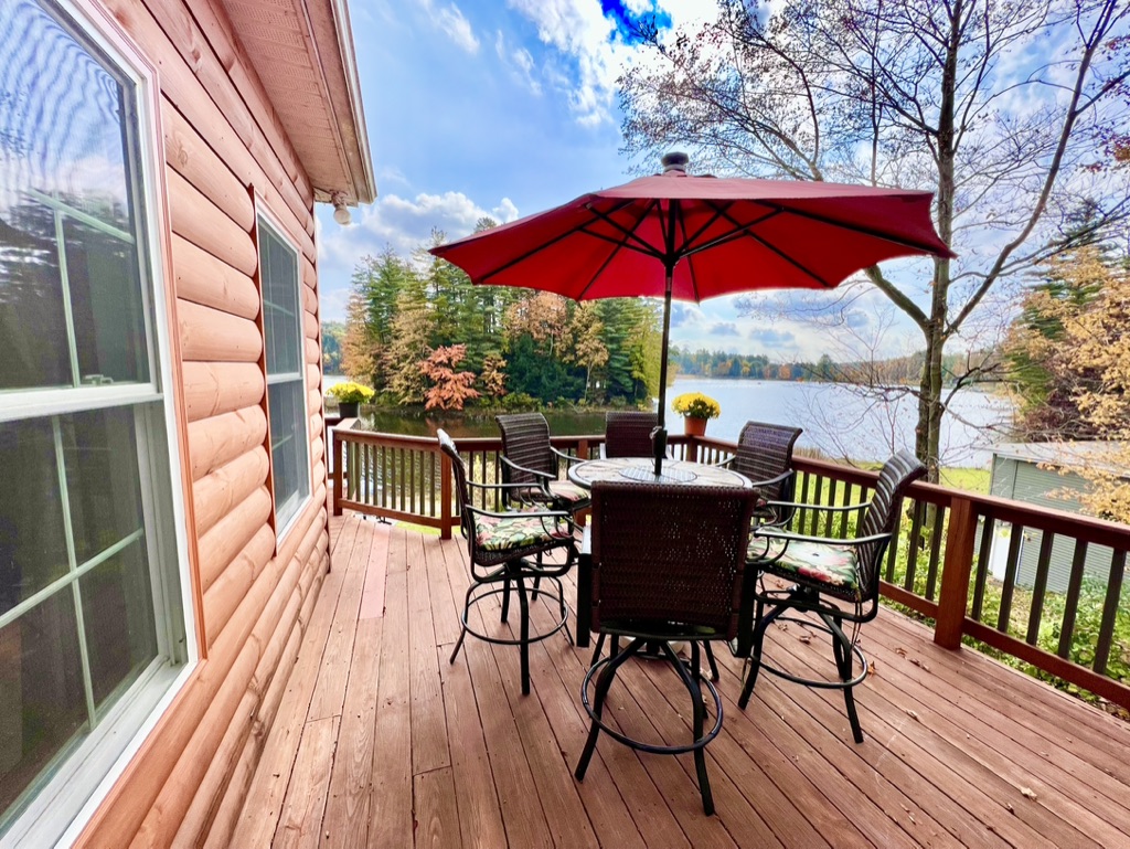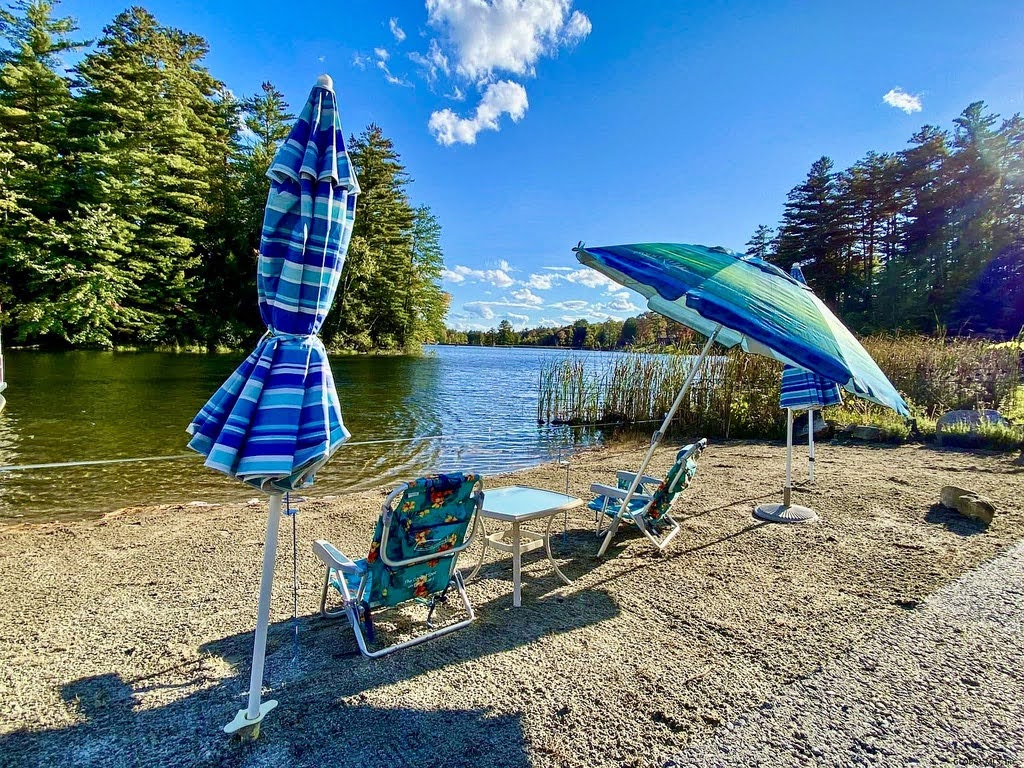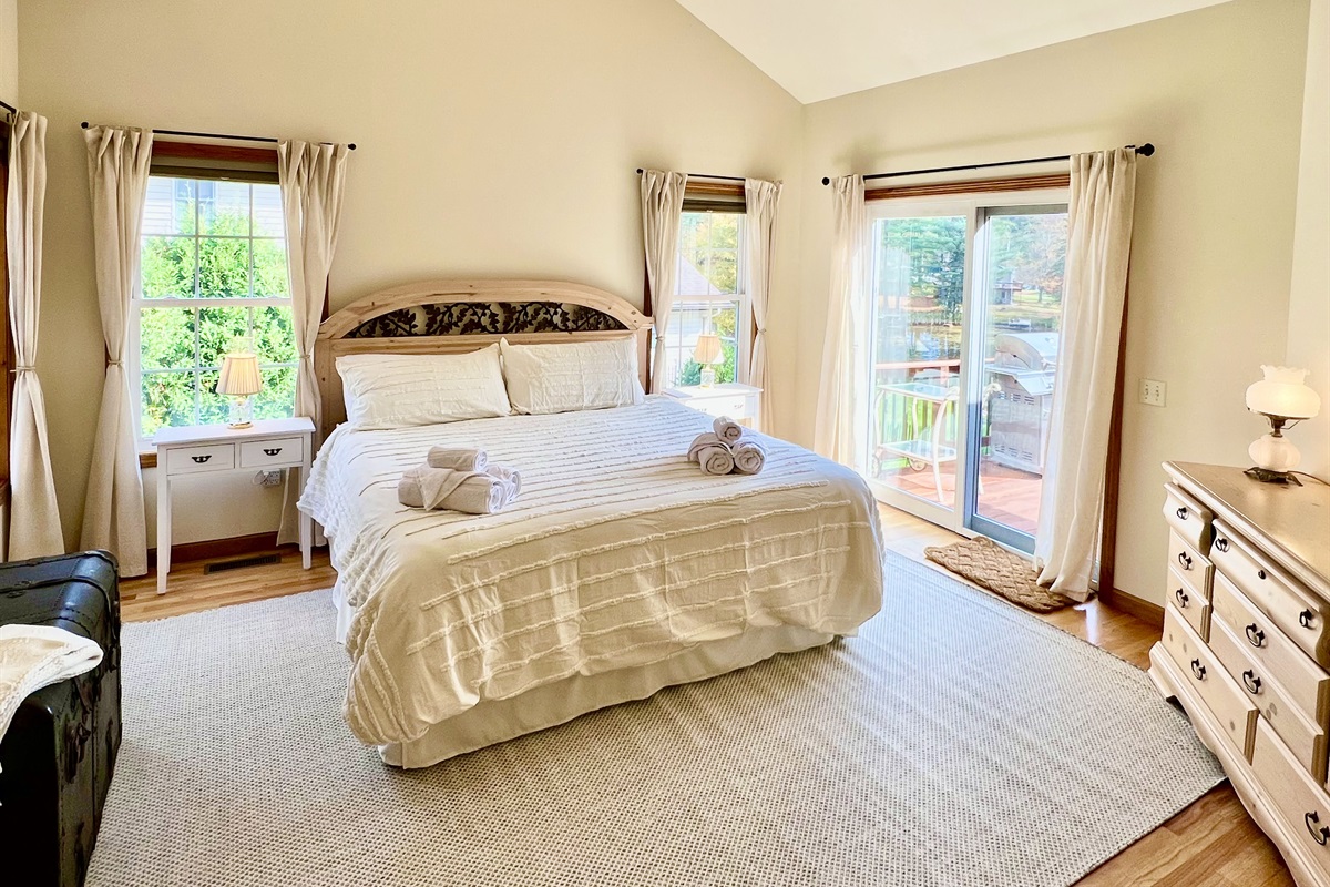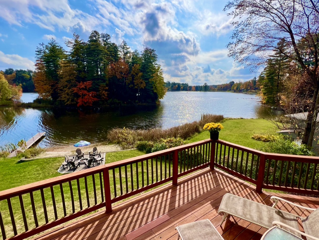 Walking out from downstairs you access the back patio with outdoor propane fireplace and furniture. There is a custom stone firepit with locally built Adirondack chairs and tables, a private sandy beach with umbrellas and beach chairs for your use, and a dock. There are two two person kayaks and one paddleboard included at the property for your use. Of course use of them is at your own risk (as is swimming) as there are no lifeguards on duty.
