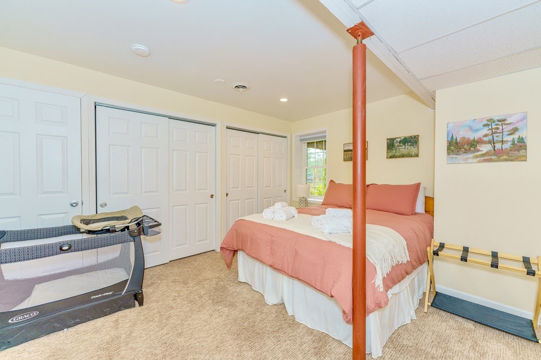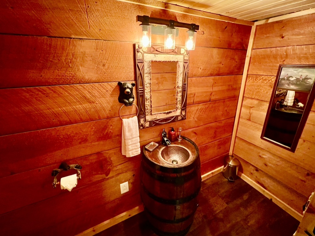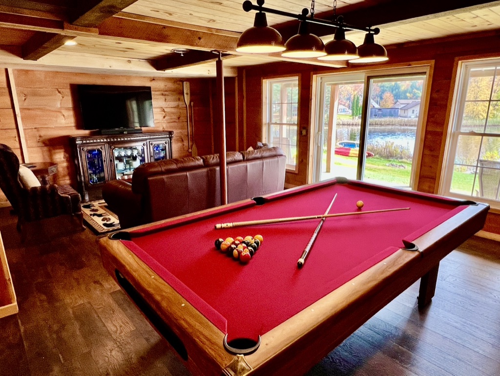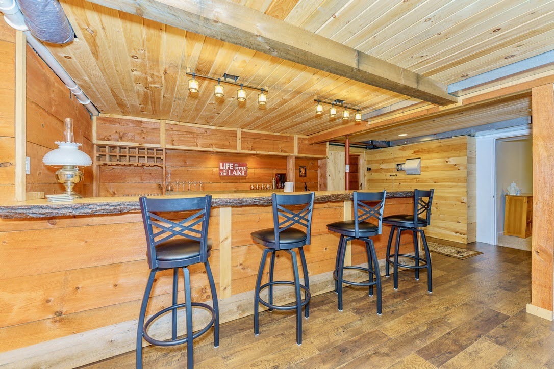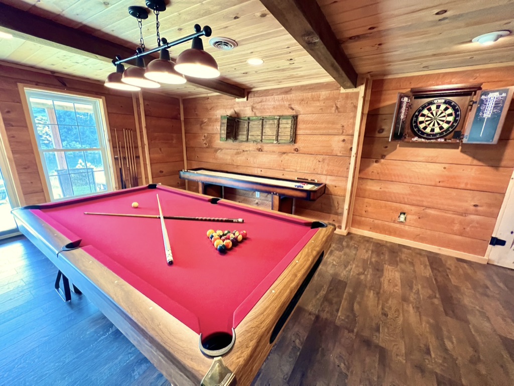Downstairs is where the real fun happens - a full Adirondack styled tavern built out with a huge custom wood bar, half bath, slate pool table, shuffleboard, dartboard, and second living room with another 58" Smart TV and sound system. There is a queen room with stowable crib, and the last room with two double beds.