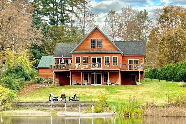 6 Bedrooms • 3 Bathrooms (2 full, 1 half) 3 Baths (2 full, 1 half) • Sleeps 11-14Welcome to our family lakehouse located on Hadlock - a serene private lake in the Adirondacks. 3200sqft, 6BRs, 2.5 baths with 100ft of lakefront, a NEW hot tub, a private dock, stone fire pit, and beach. Equipped with luxury Adirondack furnishings, a wrap around viewing deck, grill, indoor and outdoor dining, full tavern (huge bar, pool table, shuffleboard, games), two living rooms, fully equipped kitchen, an office, kayaks, and much more. Perfect for year round vacations with tons of space!
